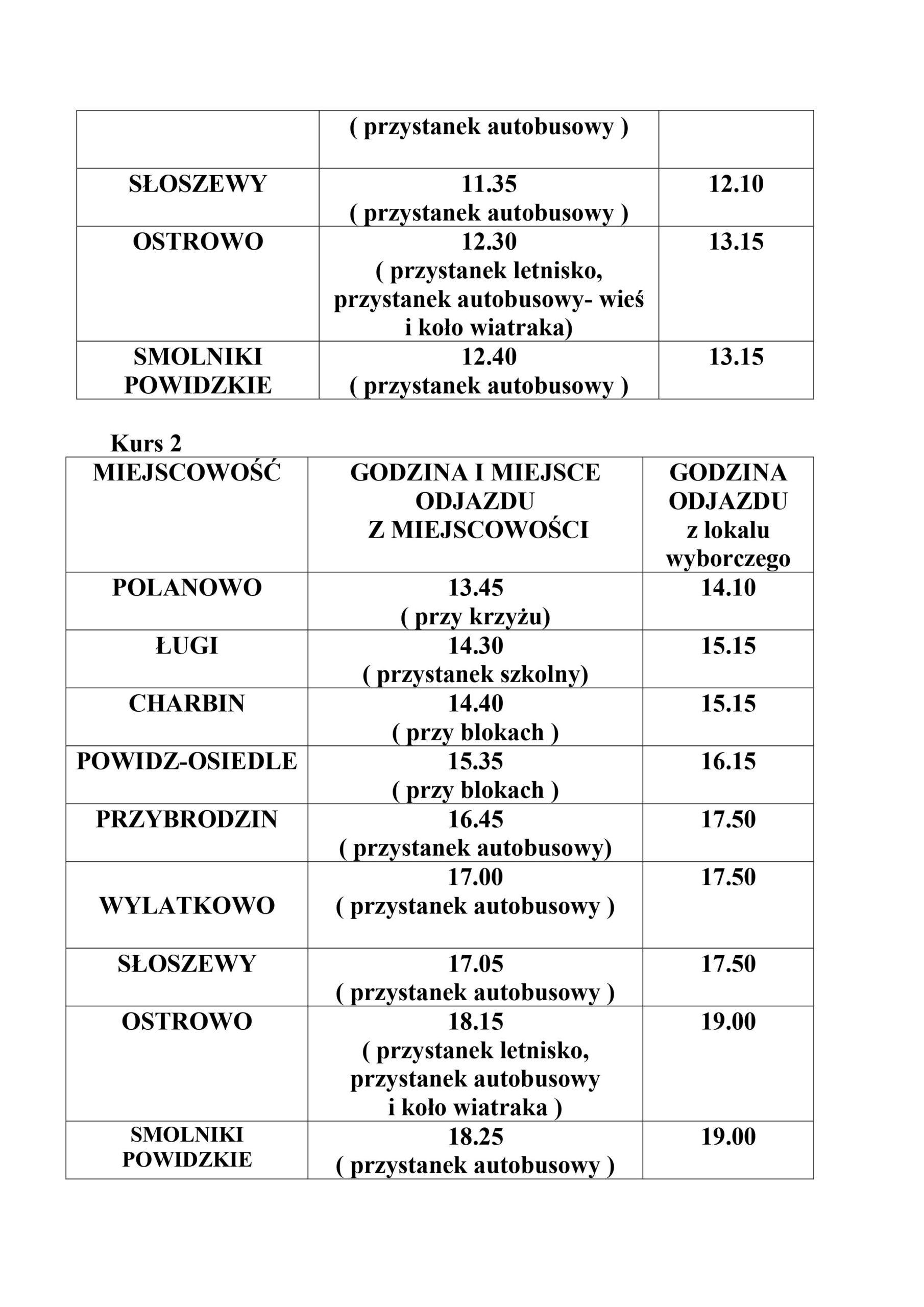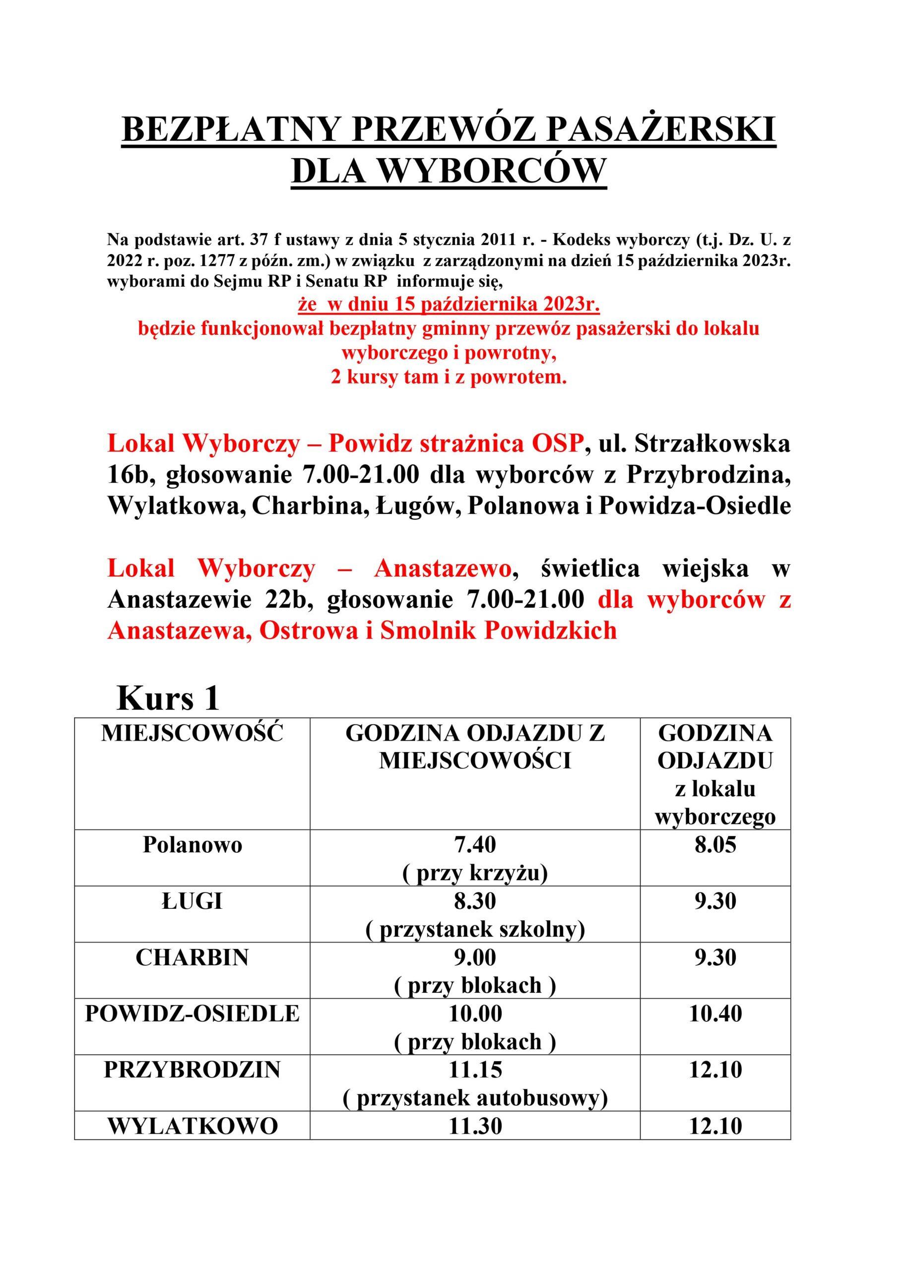 Na podstawie art. 37 f ustawy z dnia 5 stycznia 2011 r. – Kodeks wyborczy (t.j. Dz. U. z 2022 r. poz. 1277 z późn. zm.) w związku z zarządzonymi na dzień 15 października 2023r. wyborami do Sejmu RP i Senatu RP informuje się, że w dniu 15 października 2023r. będzie funkcjonował bezpłatny gminny przewóz pasażerski do lokalu wyborczego i powrotny.