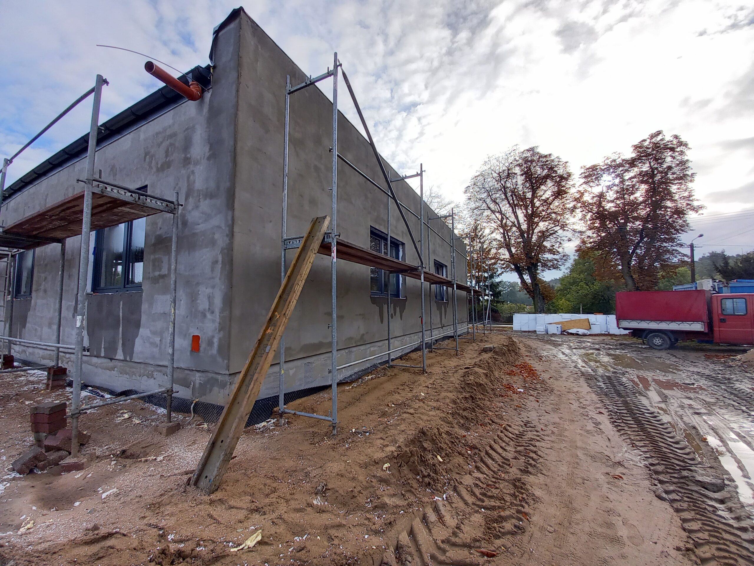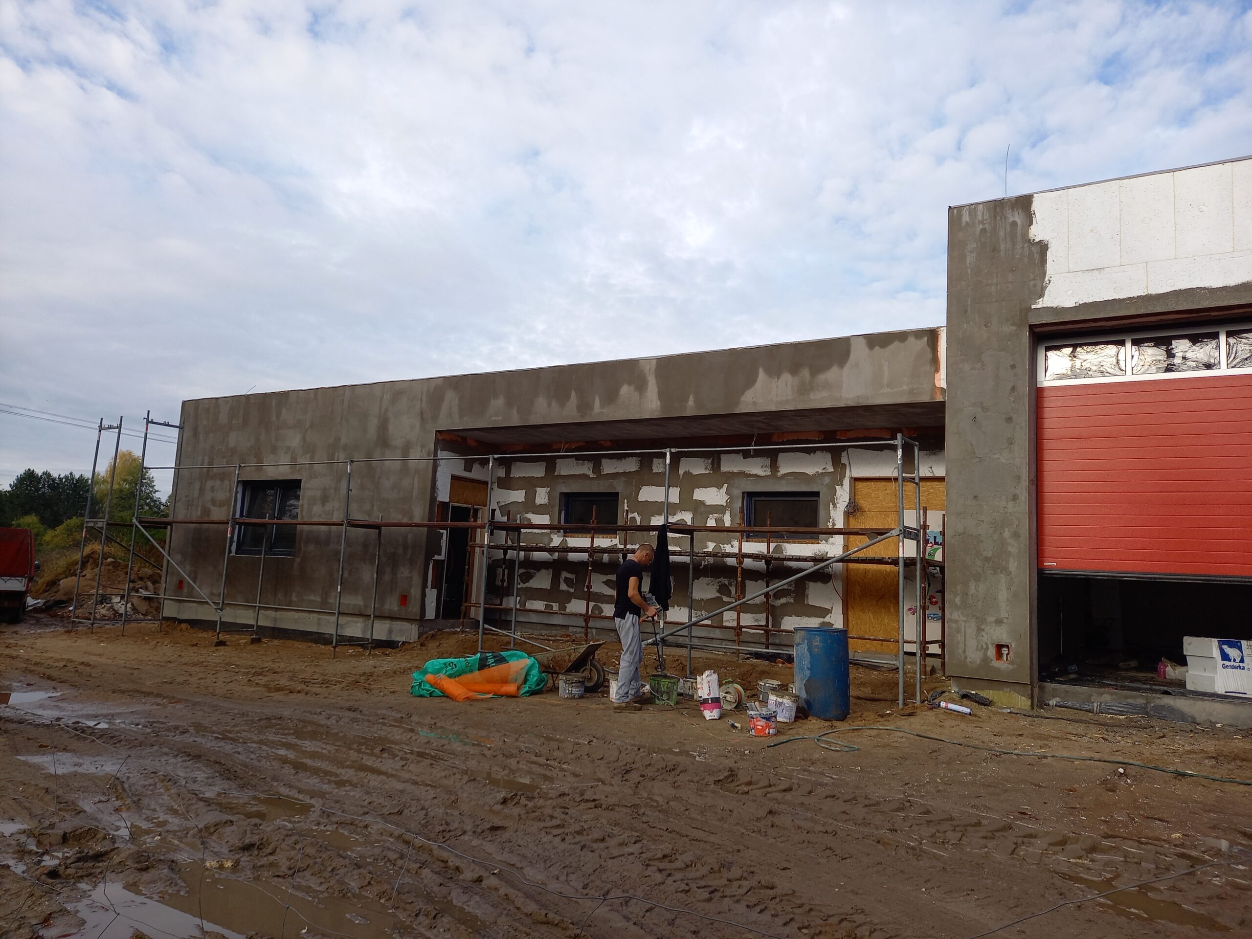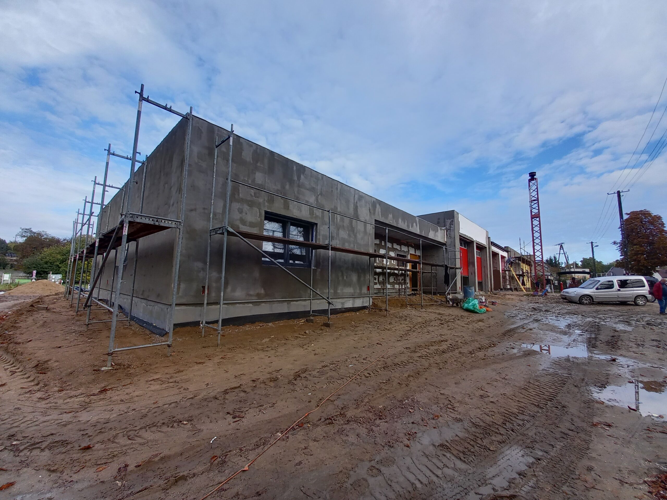 Przy budynku ZSP wykonano w całości pokrycie dachowe, taras oraz schody i podjazd przed częścią frontową budynku. Wprawione zostały okna. Wykonywane są tynki wewnątrz budynku. Zamontowane zostały rolety zewnętrzne. W najbliższym czasie planowany jest montaż ogrzewania podłogowego oraz wykonanie przyłącza do zasilenia budynku.
