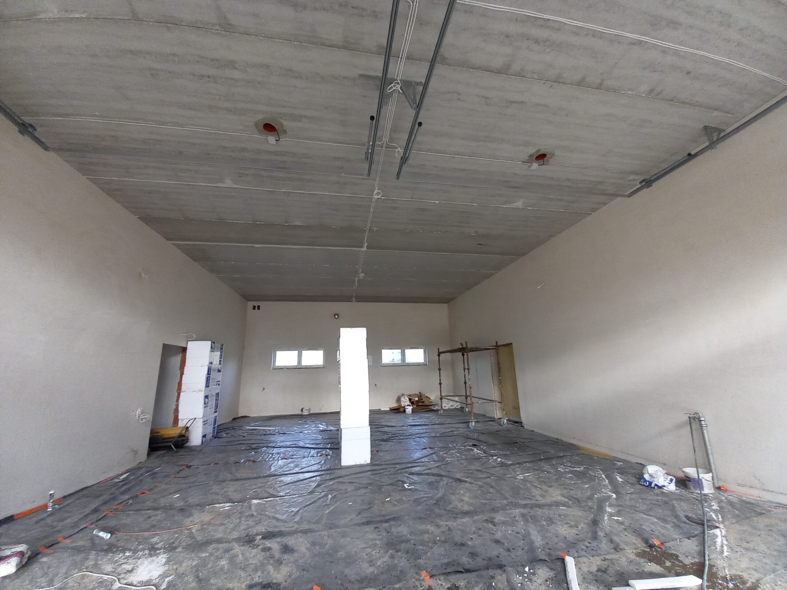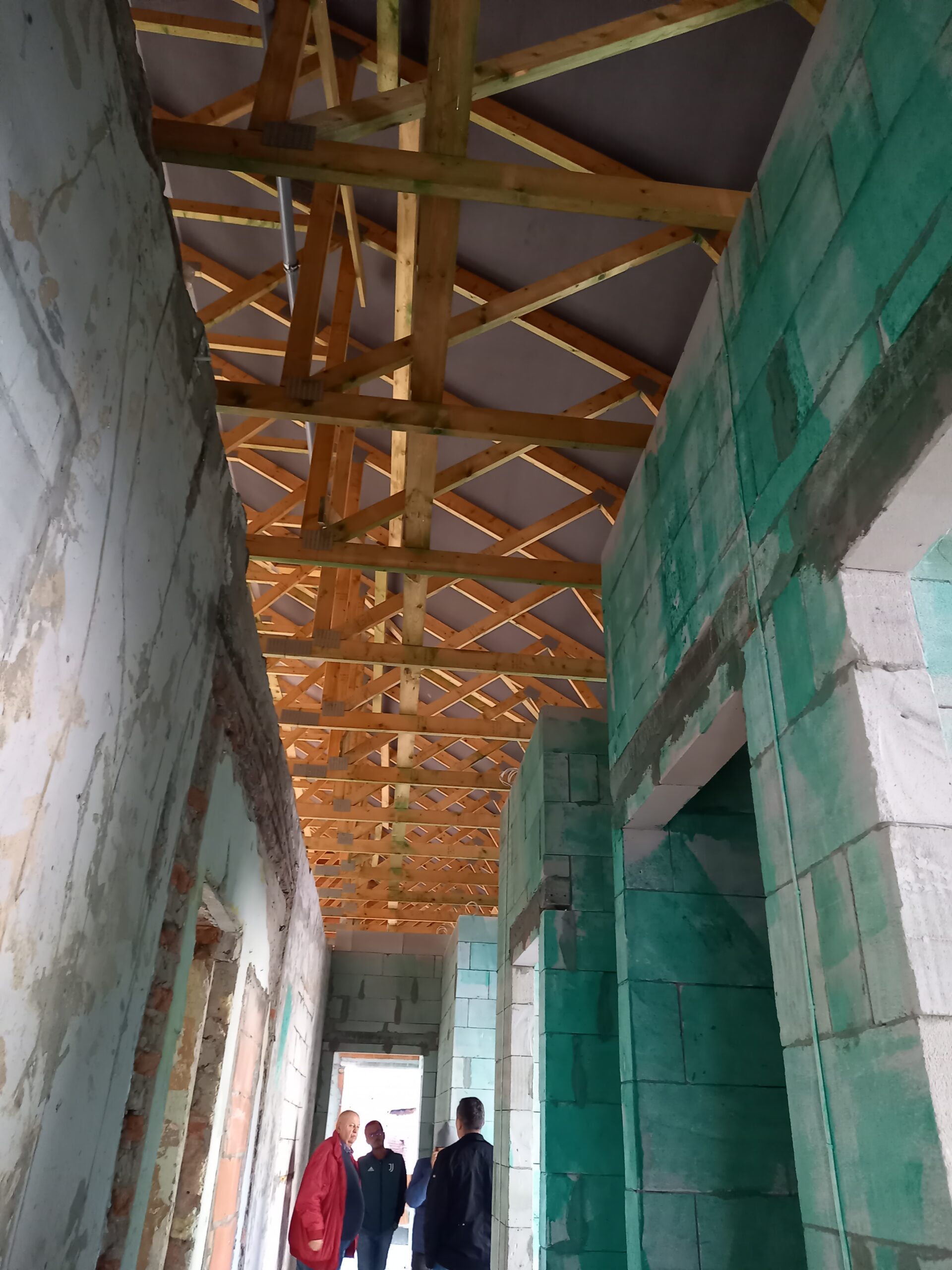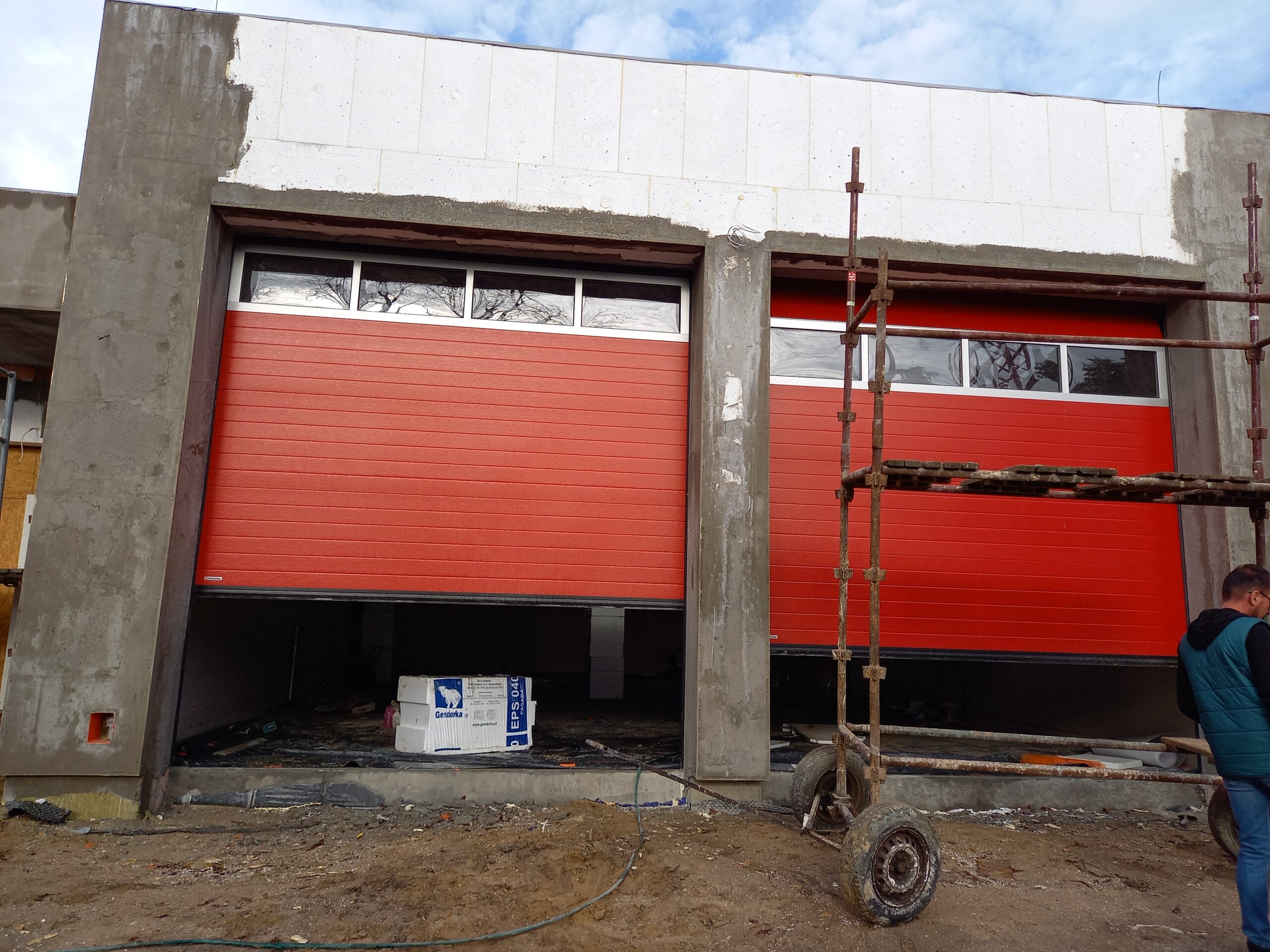 Przy budynku ZSP wykonano w całości pokrycie dachowe, taras oraz schody i podjazd przed częścią frontową budynku. Wprawione zostały okna. Wykonywane są tynki wewnątrz budynku. Zamontowane zostały rolety zewnętrzne. W najbliższym czasie planowany jest montaż ogrzewania podłogowego oraz wykonanie przyłącza do zasilenia budynku.