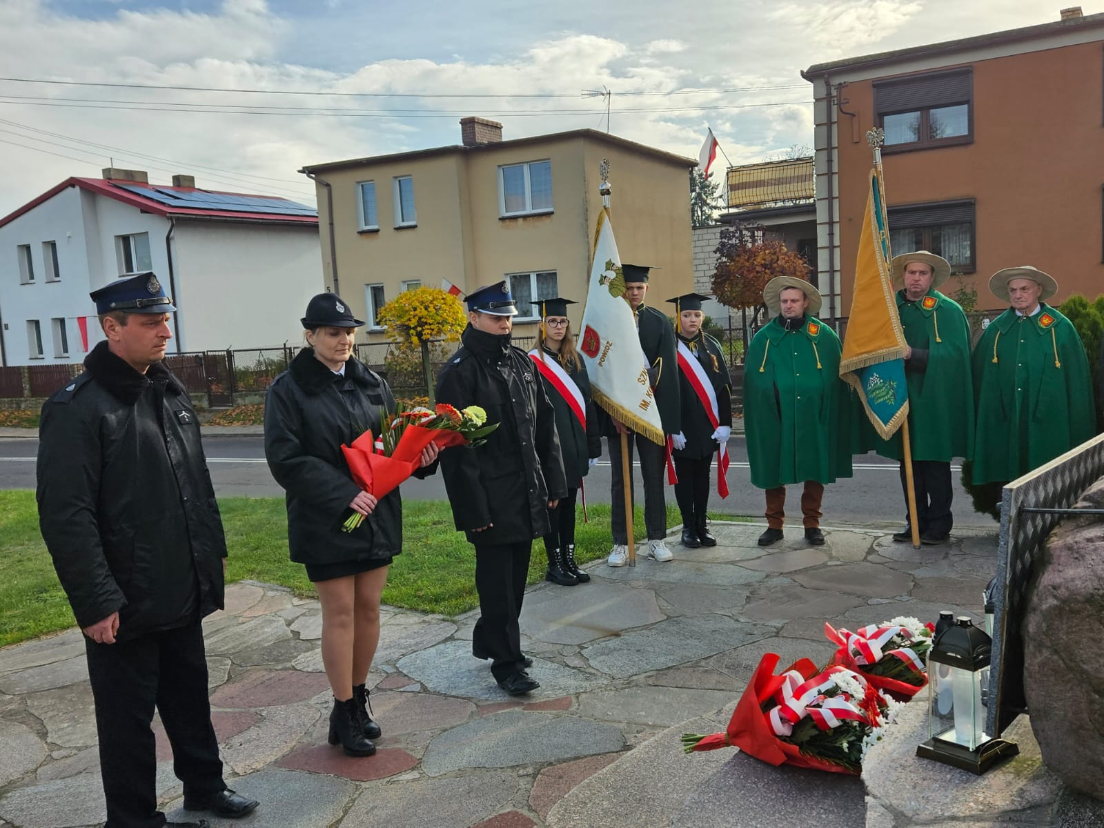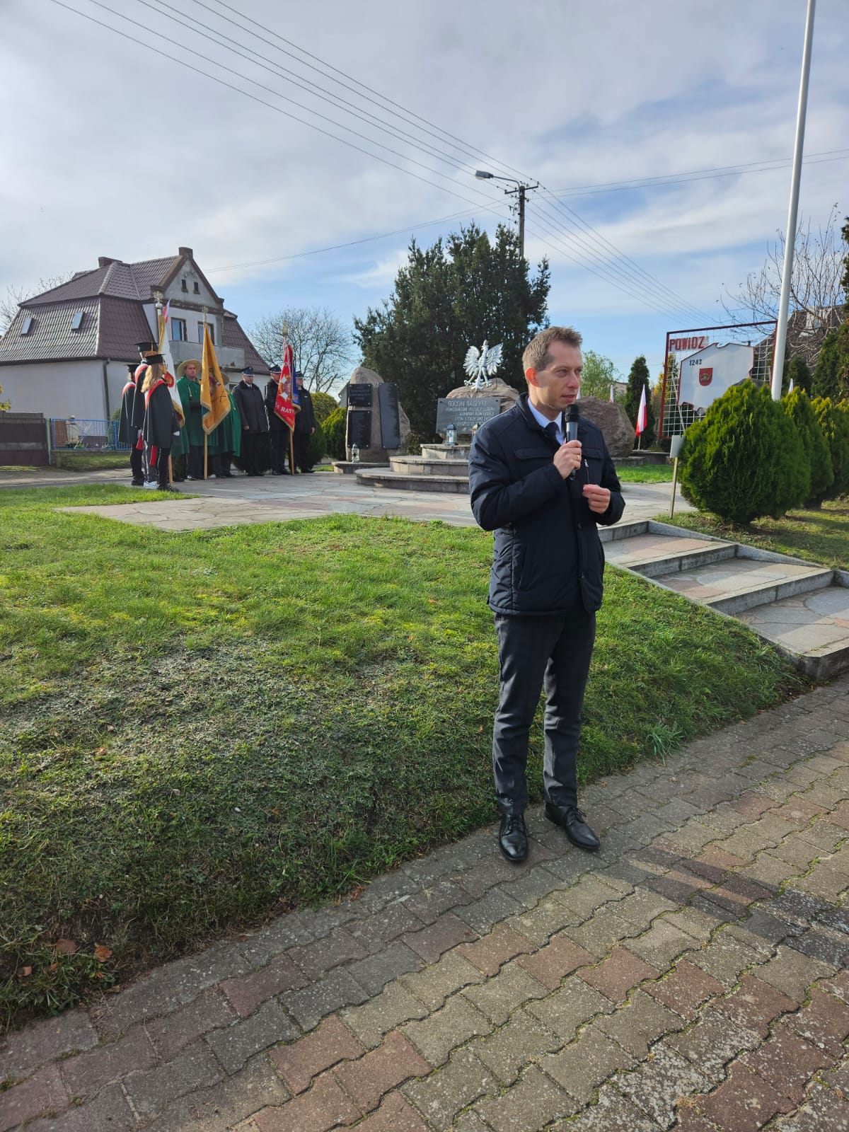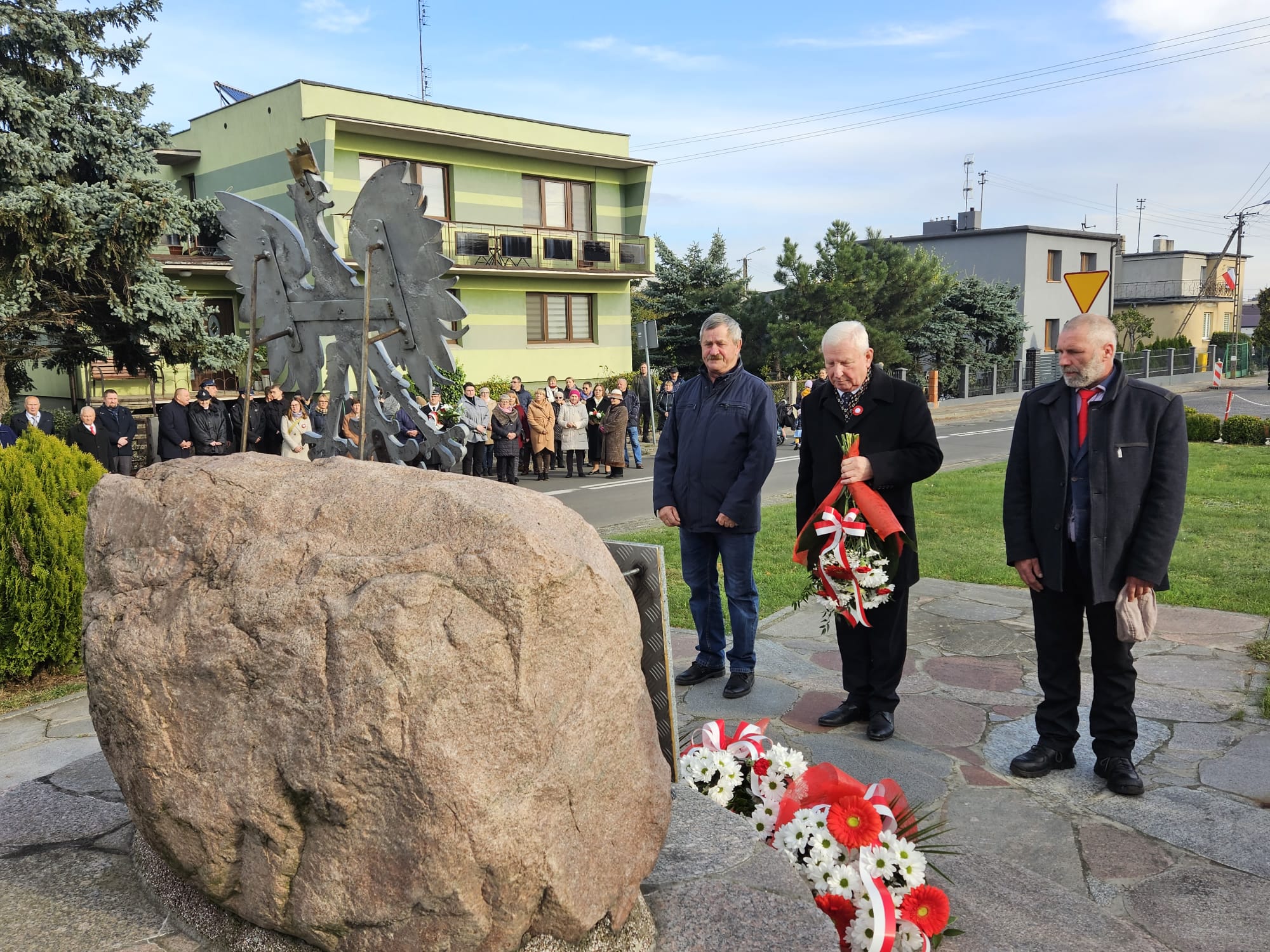 Po zakończeniu nabożeństwa nastąpił przemarsz na skwer 770-lecia, gdzie poczty sztandarowe i delegacje złożyły okolicznościowe kwiaty i zapaliły znicze pod płytą pamiątkową „Ojcom Naszym”. Następnie głos zabrał Wójt Gminy – Jakub Gwit.