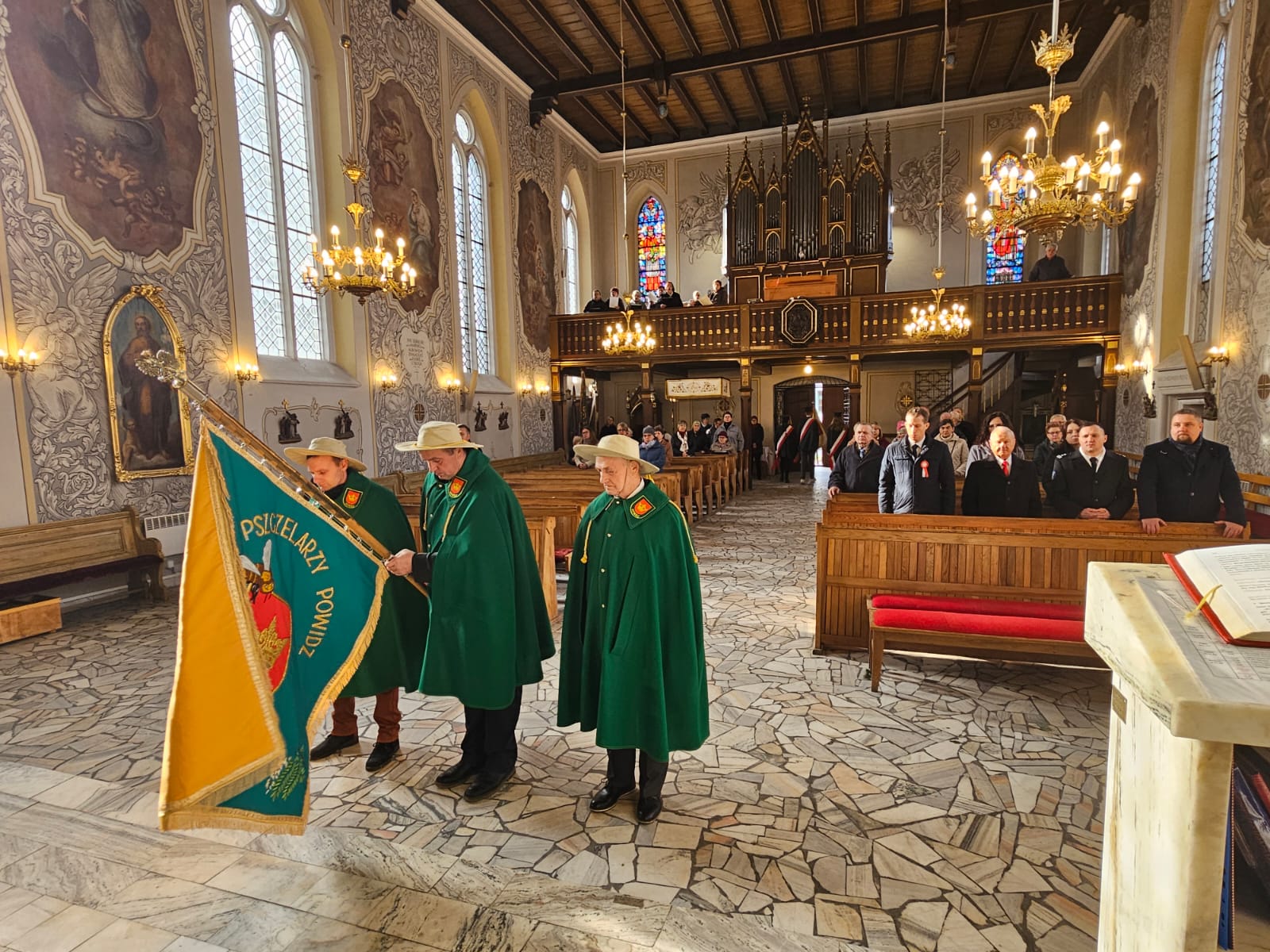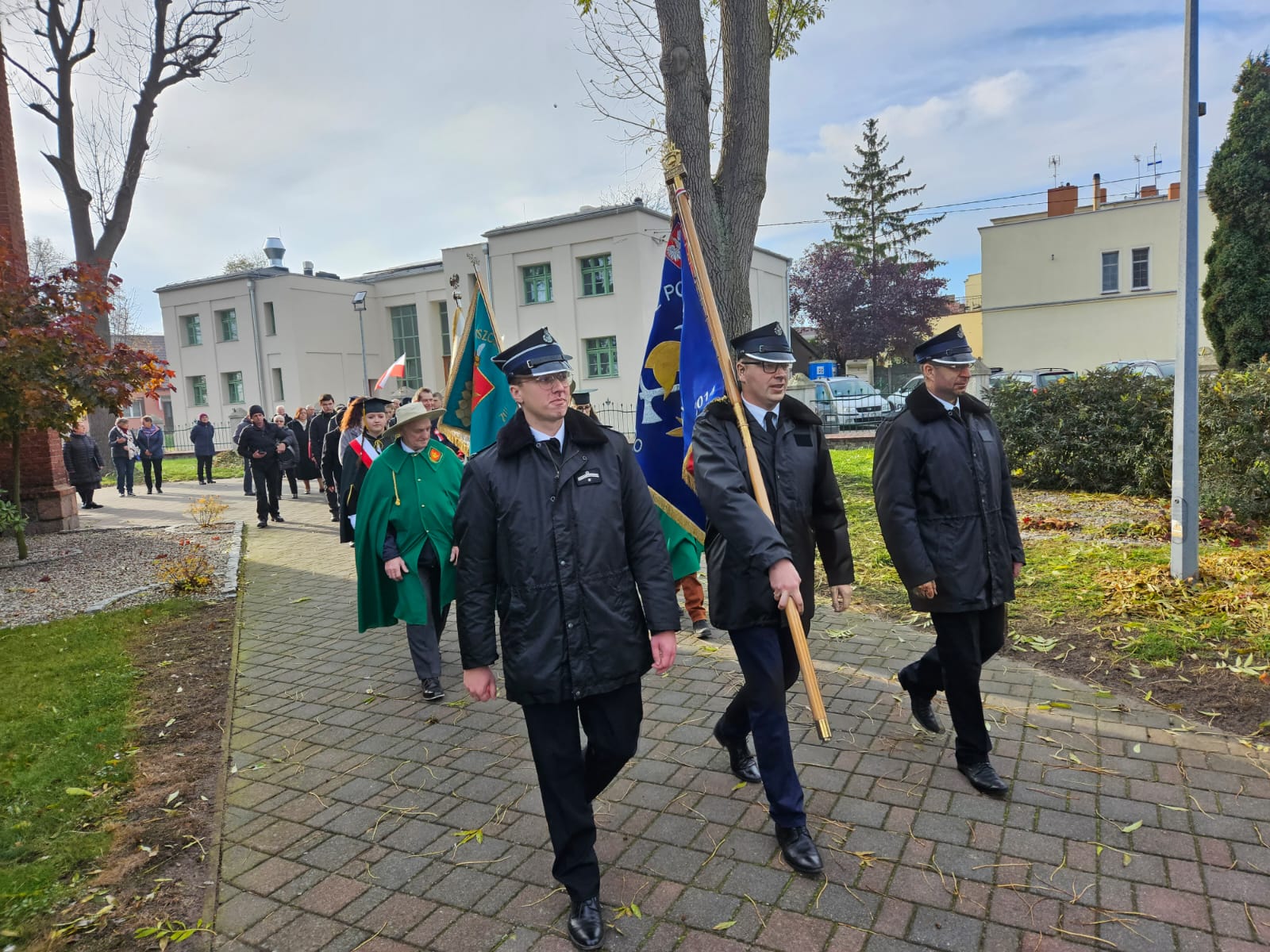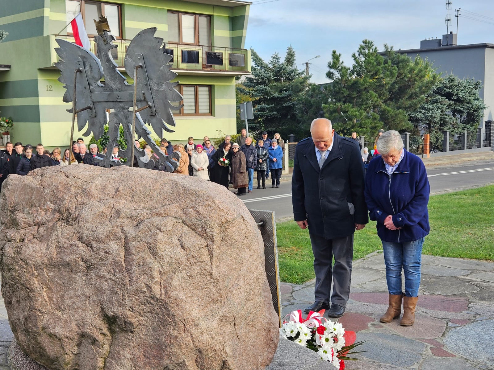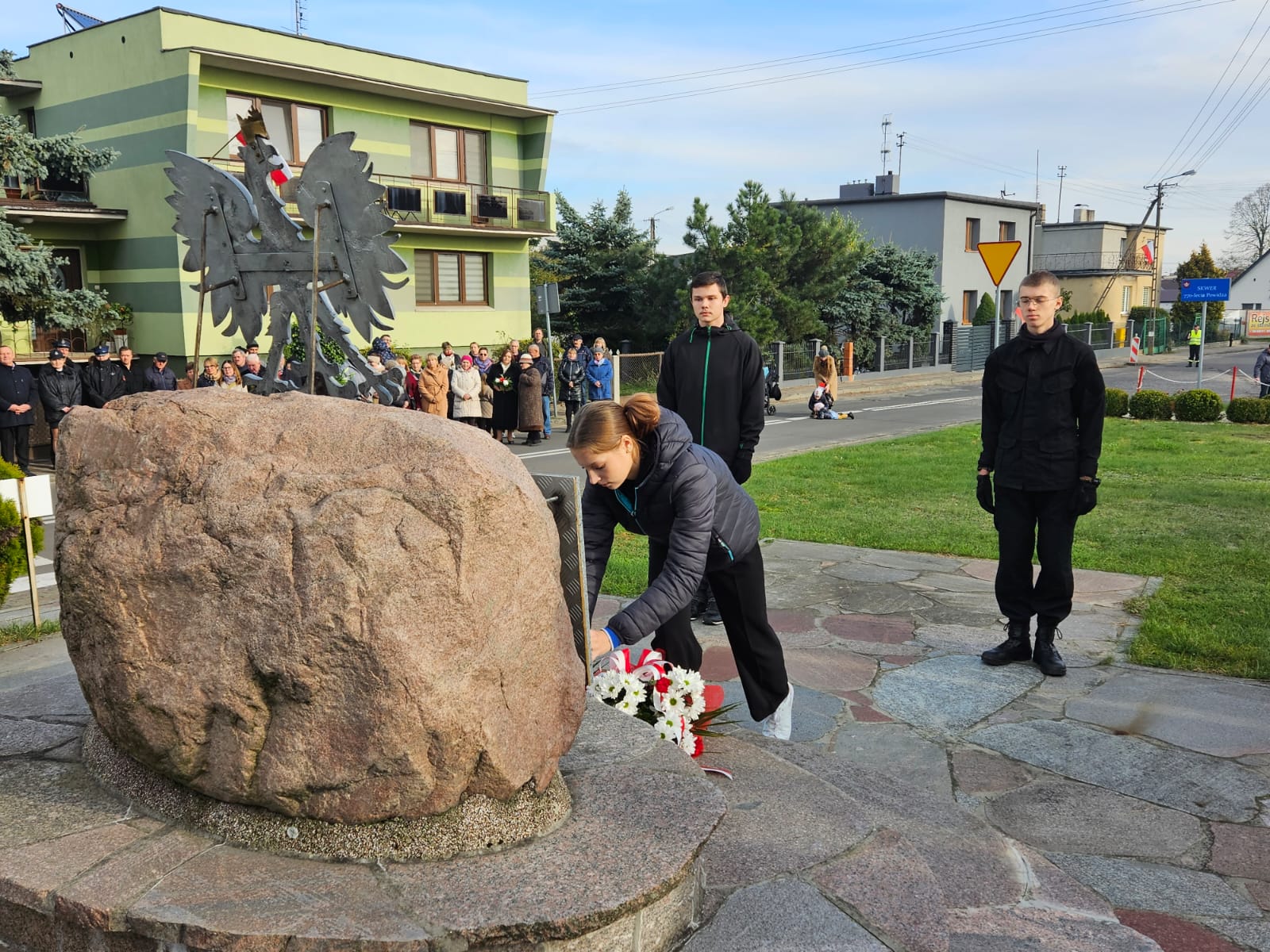 Po zakończeniu nabożeństwa nastąpił przemarsz na skwer 770-lecia, gdzie poczty sztandarowe i delegacje złożyły okolicznościowe kwiaty i zapaliły znicze pod płytą pamiątkową „Ojcom Naszym”. Następnie głos zabrał Wójt Gminy – Jakub Gwit.