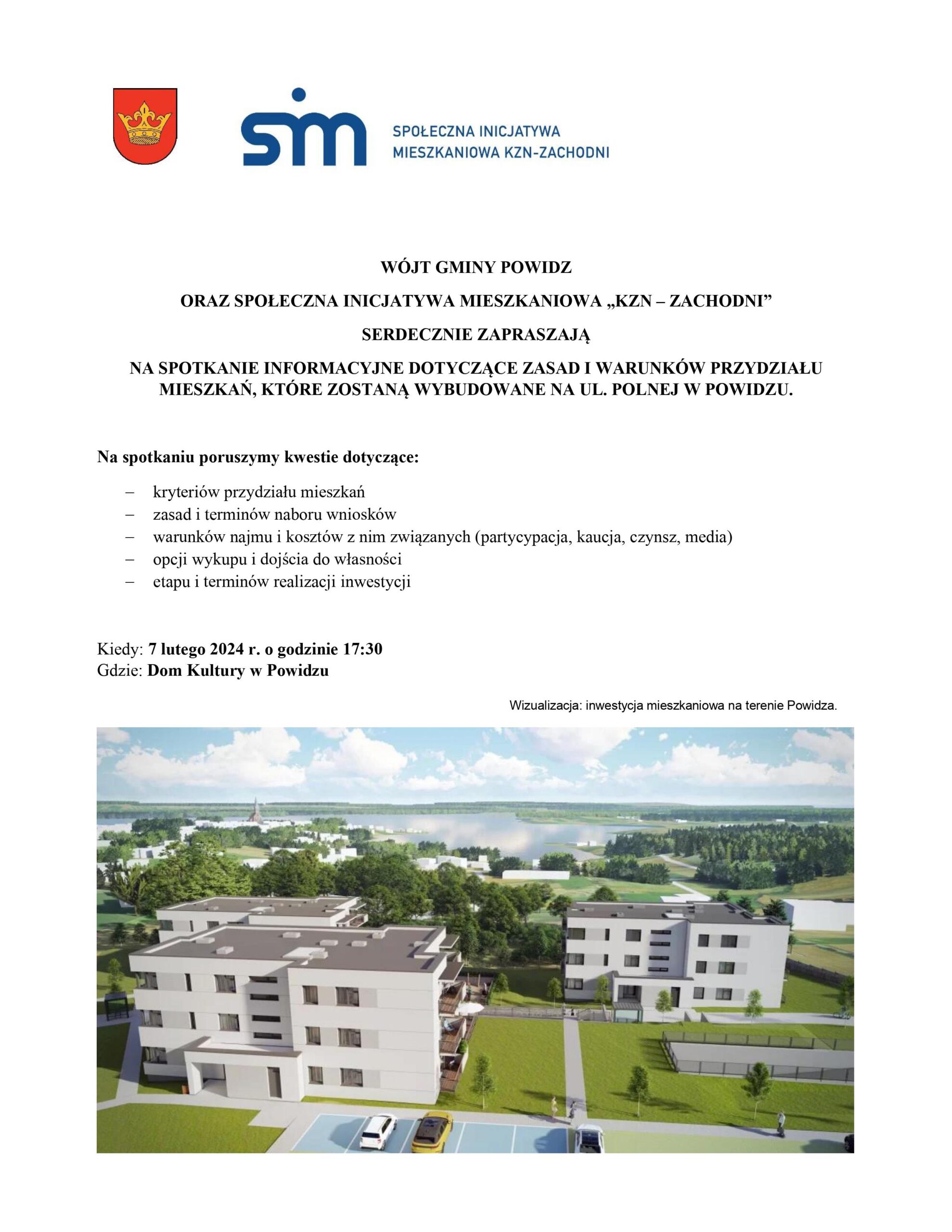 NA SPOTKANIE INFORMACYJNE DOTYCZĄCE ZASAD I WARUNKÓW PRZYDZIAŁU MIESZKAŃ, KTÓRE ZOSTANĄ WYBUDOWANE NA UL. POLNEJ W POWIDZU.