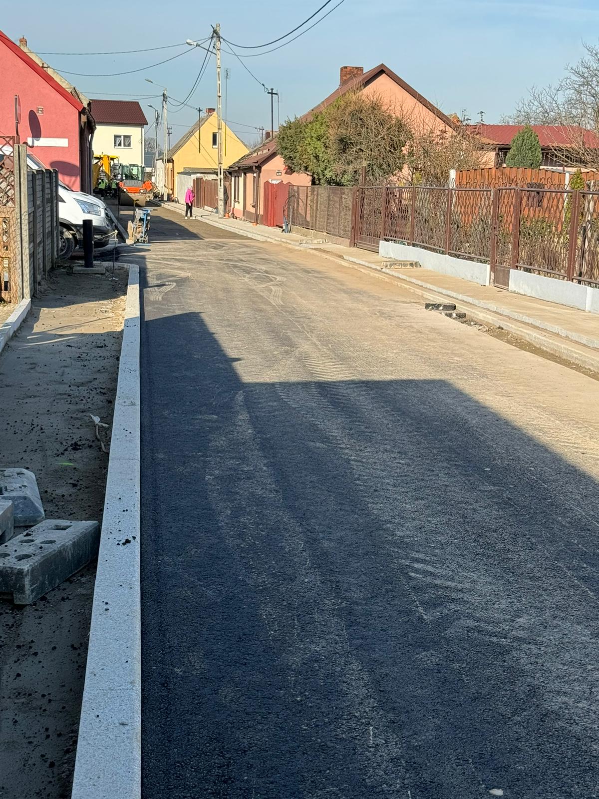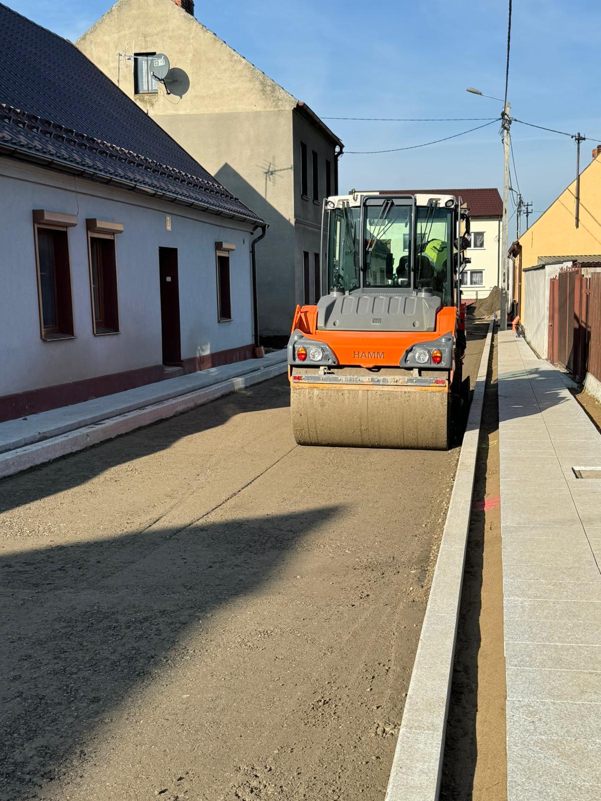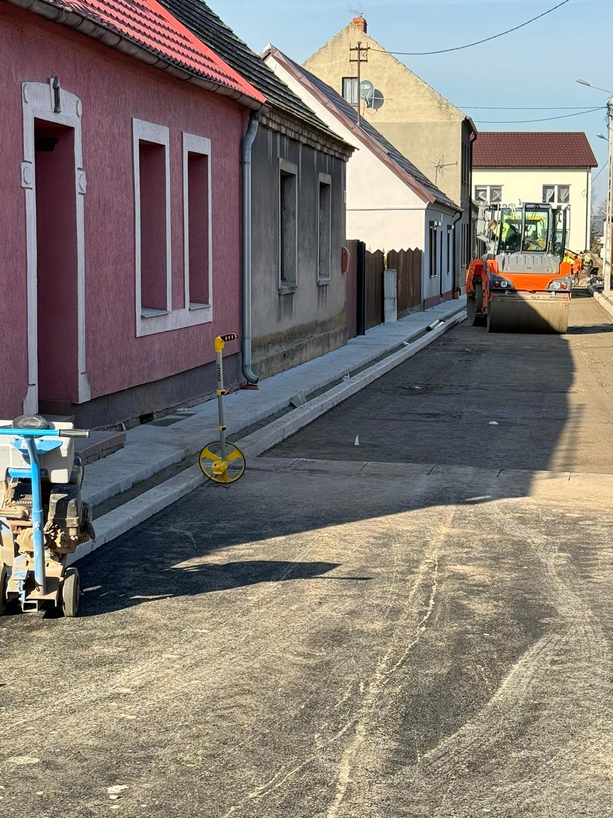 Trwa układanie podbudowy z kamienia oraz pierwszej warstwy asfaltu. Układany jest też krawężnik między jezdnią, a chodnikiem z płyt granitowych.