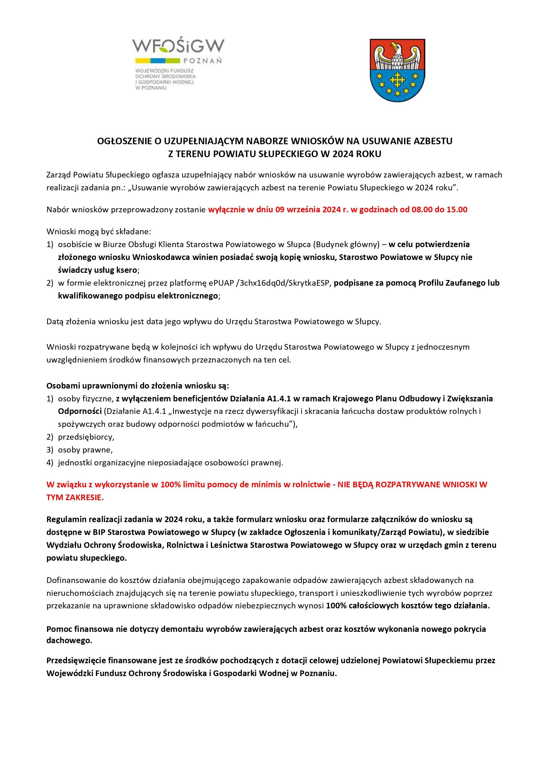 W związku z posiadanymi jeszcze środkami finansowymi na usuwanie azbestu Zarząd Powiatu Słupeckiego ogłasza uzupełniający nabór wniosków na usuwanie azbestu.
