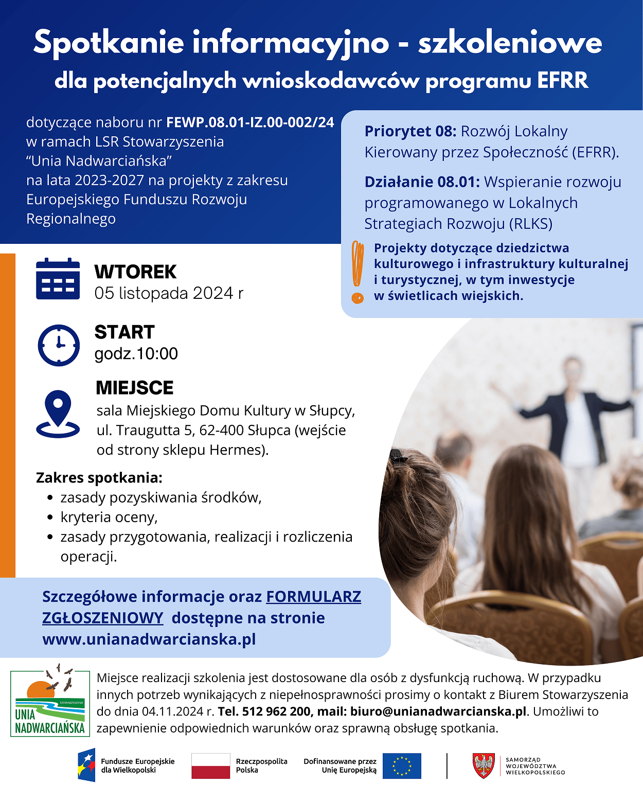 Stowarzyszenie „Unia Nadwarciańska” zaprasza na spotkanie informacyjno – szkoleniowe dla potencjalnych wnioskodawców programu EFRR dotyczące naboru nr FEWP.08.01-IZ.00-002/24 w ramach Programu Fundusze Europejskie dla Wielkopolski na lata 2021-2027 którego Instytucją Zarządzającą jest Zarząd Województwa Wielkopolskiego.