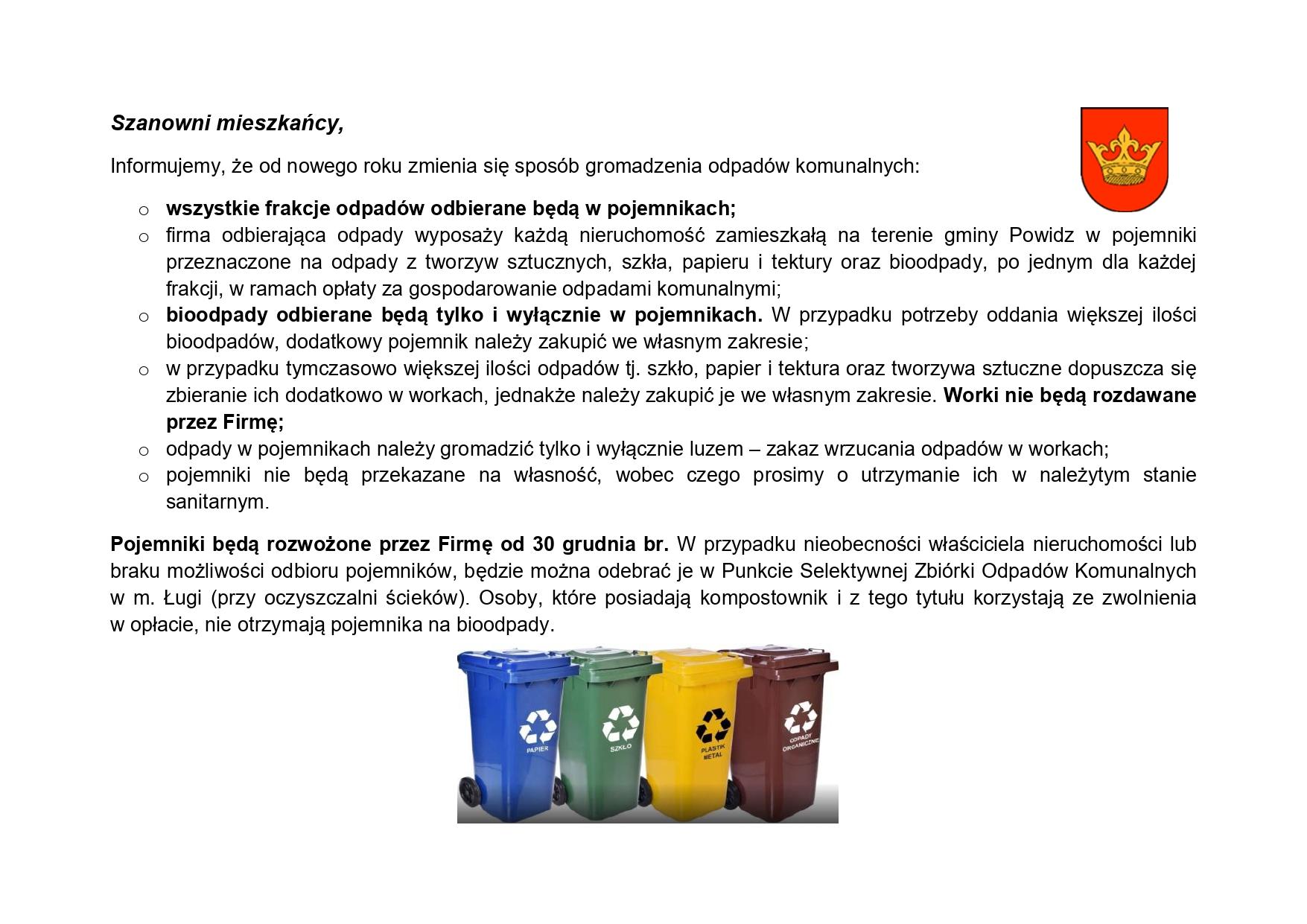 Przypominamy, że od 2025 r. zbiórka odpadów odbywać się będzie w pojemnikach. Po jednym pojemniku dla frakcji: bioodpady, tworzywa sztuczne, papier i szkoło, użyczy właścicielom nieruchomości Spółdzielnia w ramach opłaty za gospodarowanie odpadami komunalnymi.