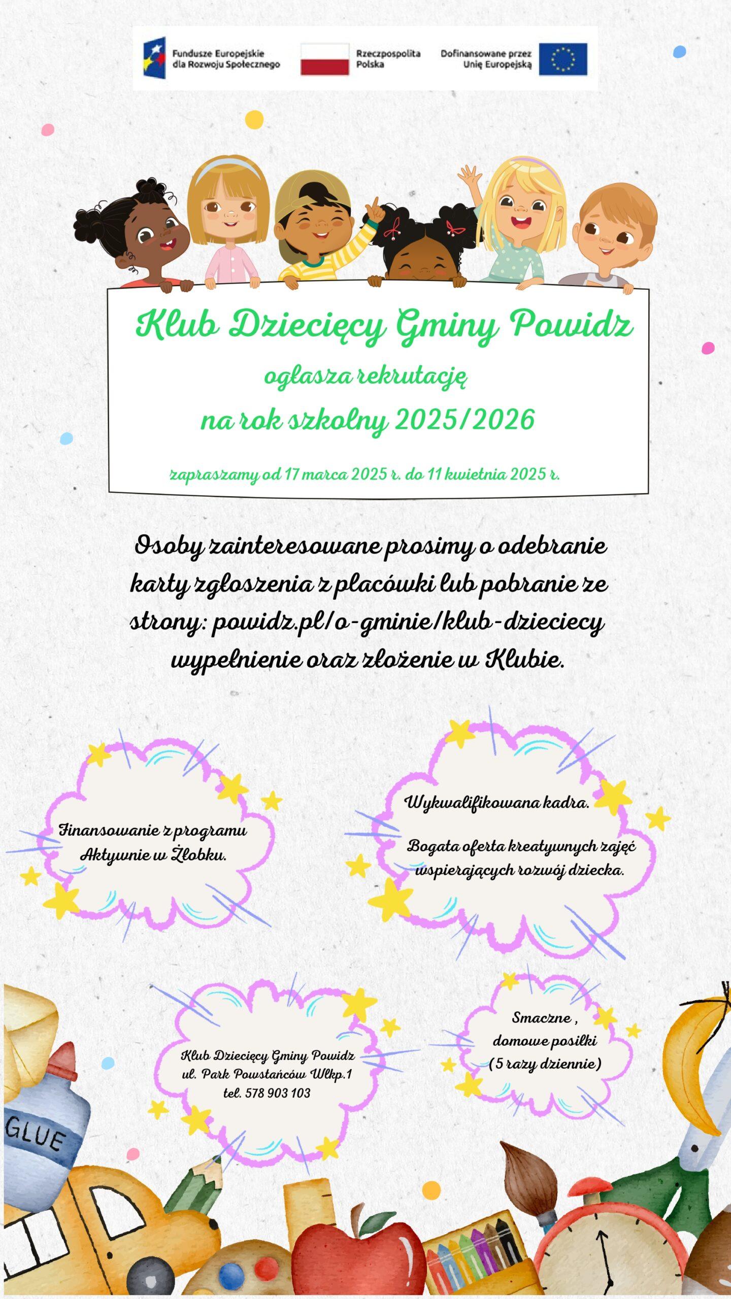 Zainteresowani mogą odebrać kartę zgłoszenia z placówki Klubu lub pobrać na naszej stronie: powidz.pl/o-gminie/klub-dzieciecy