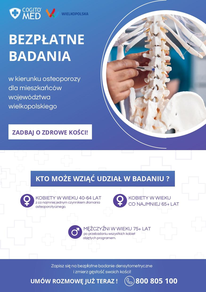 Samorząd Województwa Wielkopolskiego oraz Cogito Med zapraszają na bezpłatne badania w kierunku osteoporozy dla mieszkańców Województwa Wielkopolskiego.