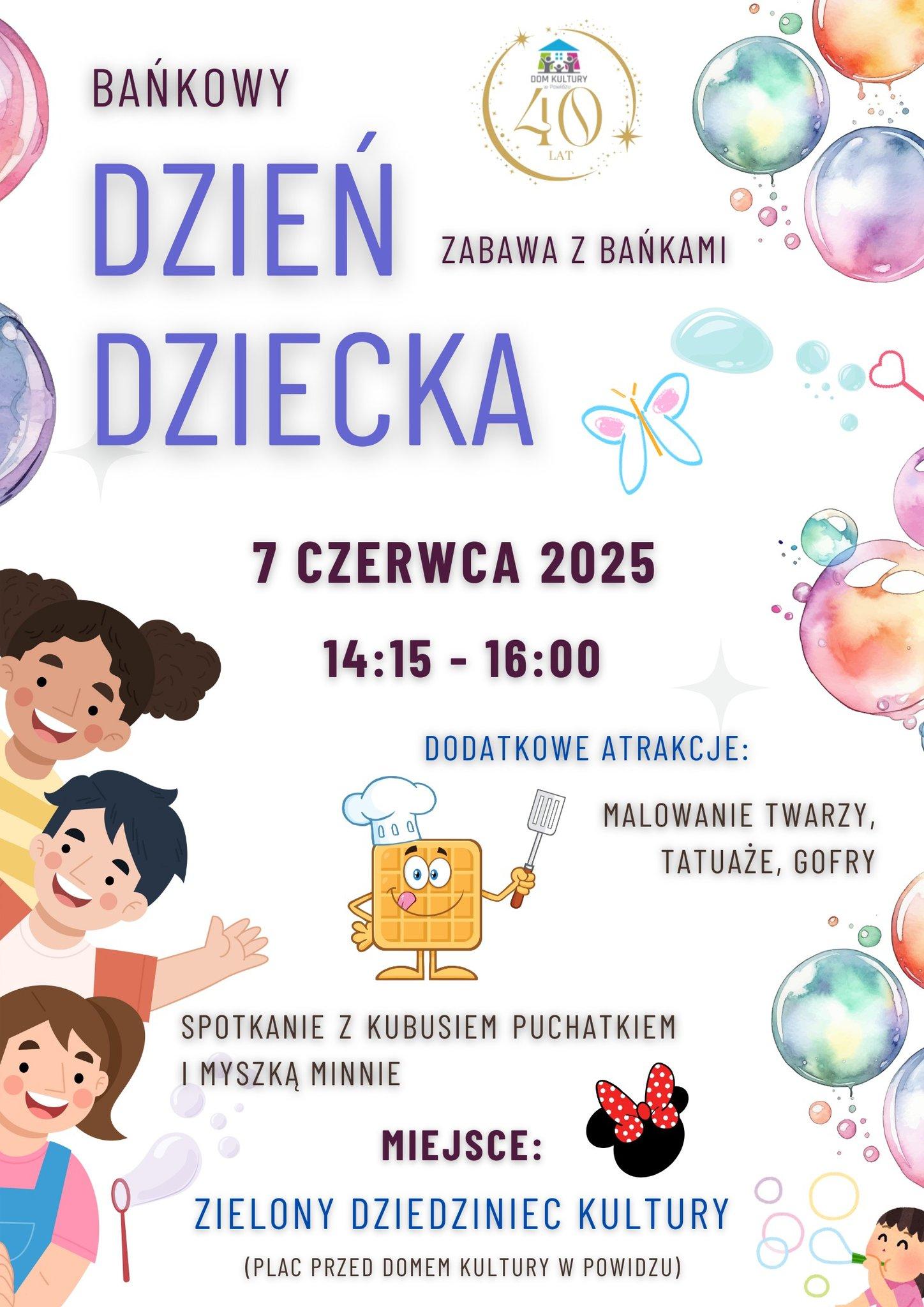 Czeka nas Festwial Baniek Mydlanych, malowanie twarzy, tatuaże, gofry, spotkanie z Kubusiem Puchatkiem i Myszką Minnie.