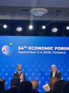 W dniach 2-3 września br. Wójt Gminy Powidz Jakub Gwit wziął udział w 34. edycji Forum Ekonomicznego, które odbyło się w Karpaczu. Pan Wójt był uczestnikiem panelu ,,Zatrzymać wodę,” w którym uczestniczyli też: Poseł na Sejm RP Jarosław Sachajko, Wiceminister Infrastruktury Przemysław Koperski, Prezes Wojewódzkiego Funduszu Ochrony Środowiska i Gospodarki Wodnej w Poznaniu Rafał Ratajczak, Łukasz Wiejaczka z Instytutu Geografii i Zagospodarowania Przestrzennego PAN oraz Paweł Sikorski z Izby Gospodarczej Wodociągi Polskie. Panel prowadził Jakub Paszyński z portalu ecoekonomia.pl.