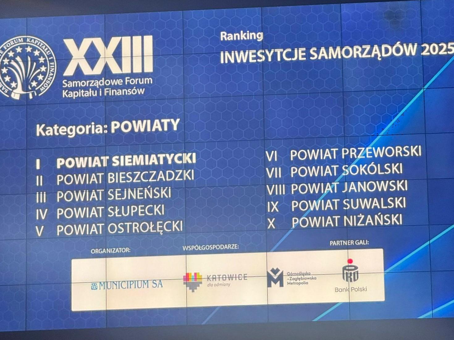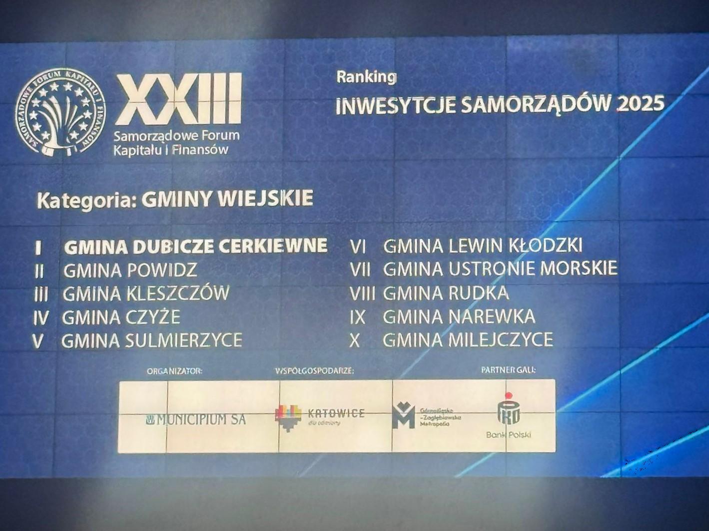 Podczas XXIII Samorządowego Forum Kapitału i Finansów odbywającego się w Międzynarodowym Centrum Kongresowym w Katowicach, w dniu 6 października wręczone zostały wyróżnienia m. in. dla laureatów rankingu czasopisma samorządowego „Wspólnota” INWESTYCJE SAMORZĄDÓW 2025.