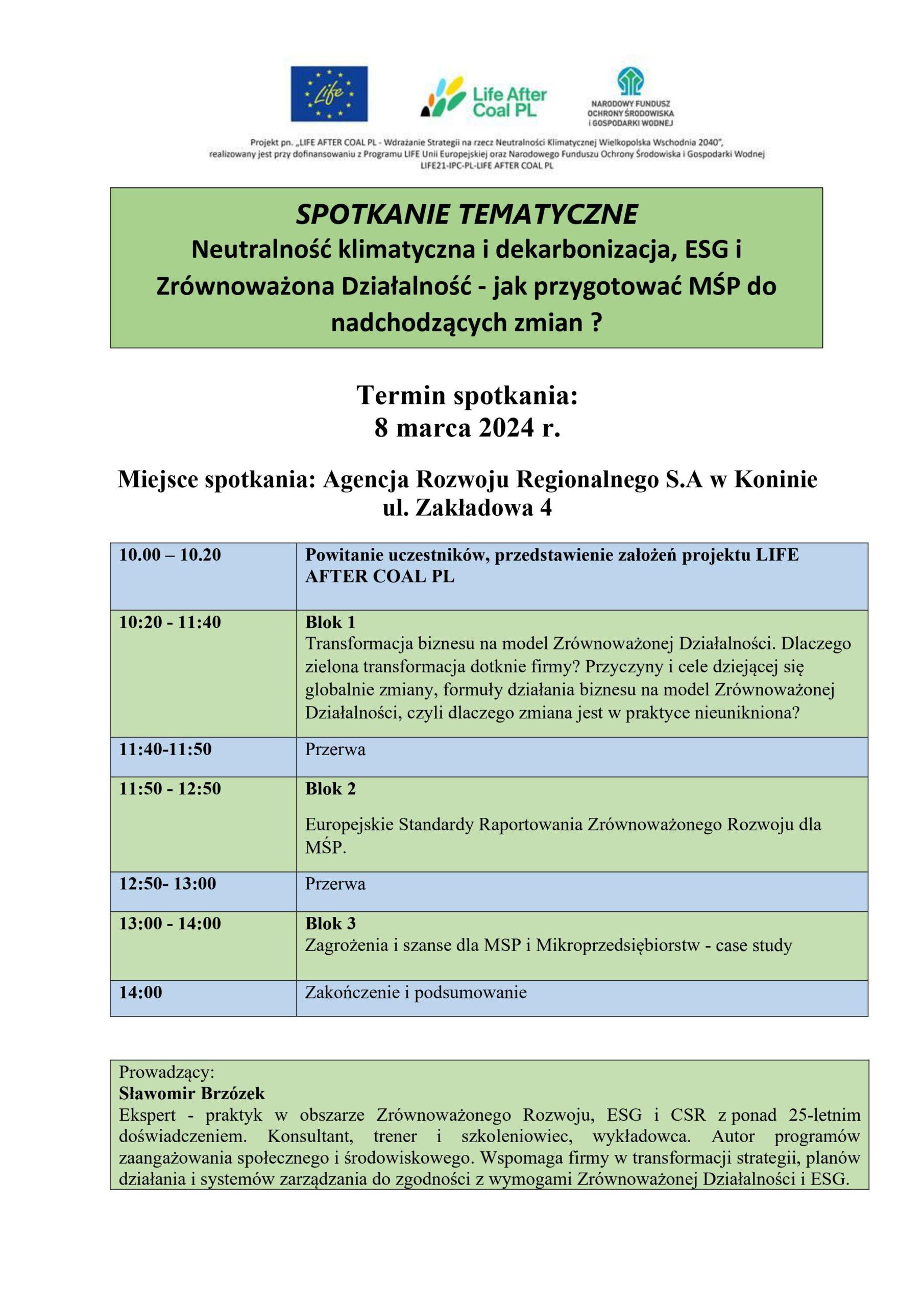 Agencja Rozwoju Regionalnego S.A w Koninie organizuje spotkanie tematyczne pn.: „Neutralność klimatyczna i dekarbonizacja, ESG i Zrównoważona Działalność – jak przygotować MŚP do nadchodzących zmian?”