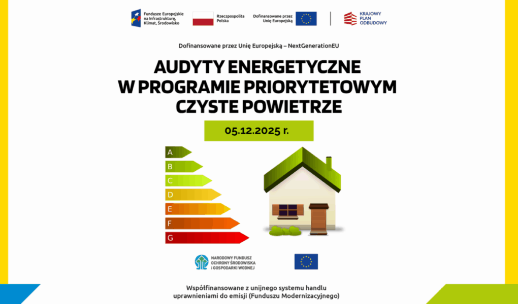 WFOŚiGW w Poznaniu organizuje w dn. 05.12.2025 r. spotkanie informacyjne dla audytorów energetycznych, wykonujących audyty, dokumenty podsumowujące audyty energetyczne oraz świadectwa charakterystyki energetycznej do wniosków o dofinansowanie w Programie Czyste Powietrze. Spotkanie skierowane jest do audytorów energetycznych wpisanych do Centralnego rejestru
