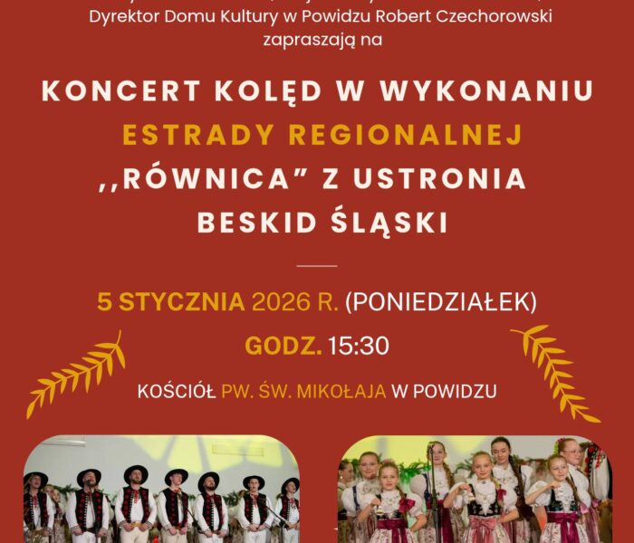 Serdecznie zapraszamy na KONCERT KOLĘD w wykonaniu Estrady Regionalnej „Równica” z Ustronia, Beskid Śląski5 stycznia 2026 r. – godz. 15:30Kościół pw. św. Mikołaja w Powidzu Wstęp wolny!