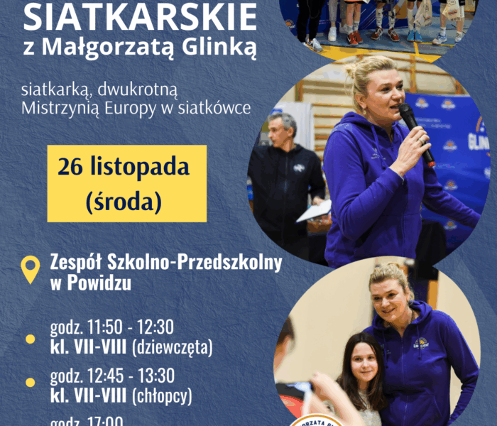 26 listopada br. dwukrotna Mistrzyni Europy w siatkówce, Mistrzyni Polski, Tryumfatorka Ligi Mistrzów – Małgorzata Glinka, odwiedziła Powidz.W pierwszej części spotkania odbyły się treningi z uczniami Szkoły Podstawowej w Powidzu, grupami dziewcząt i chłopców z klas VII-VIII..